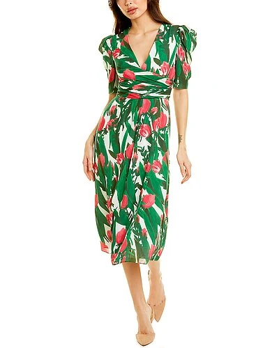 - Puff Sleeve V-Neck Silk Dress in green multicolor